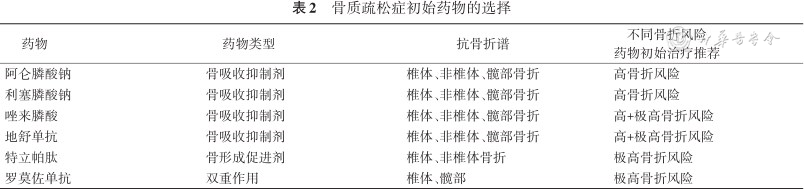 | 阿仑膦酸钠 | 骨吸收抑制剂 | 椎体、非椎体、髋部骨折 | 高骨折风险 |