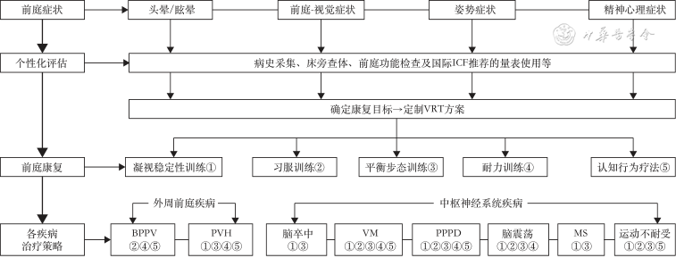 注:VRT为前庭康复治疗;ICF为功能、残疾和健康状况的国际分类;BPPV为良性阵发性位置性眩晕;PVH为外周前庭功能减退;VM为前庭性偏头痛;PPPD为持续性姿势-知觉性头晕;MS为多发性硬化