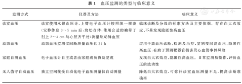 | 诊室血压 | 诊室使用水银血压计、上臂电子血压计按照统一规范(安静休息3~5 min后,放松身体,使用合适的袖带于肘上2~3 cm与心脏齐平处)测量肱动脉血压 | 临床诊断及分级的标准方法及主要依据。存在白大衣效应、不易发现隐匿性高血压 |