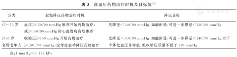 | 分类 | 起始降压药物治疗时机 | 降压目标 |