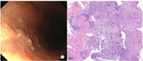 患者,男性,69岁,以"吞咽困难1个月余"为主诉,于2020-05-10就诊于厦门市中医院。患者1个月余前无明显诱因出现吞咽不畅,以进食干性食物为主,尚能进食半流质食物,伴反酸烧心、嗳气,无腹痛腹泻,无恶心呕吐等,经抑酸护胃治疗后稍好转,门诊查血常规:"白细胞:7.7×109/L,嗜酸性粒细胞百分比:24.6%,嗜酸性粒细胞:1.89×109/L,血红蛋白:148 g/L,血小板计数:226×109/L";胃镜示"1.慢性萎缩性胃炎2.食管黏膜粗糙(图1)";病理(图1):"食管黏膜慢性活动性炎症,上皮下间质炎性肉芽组织增生,可见较多嗜酸性粒细胞浸润(大于15个/高倍镜视野)";腹部彩超示"肝S7段见偏低回声结节,范围约22 mm×16 mm,边缘尚清,S8段隐约见偏低回声区,范围约9 mm×7 mm,边缘模糊;提示肝内低回声结节性质待查",为求诊治,门诊拟"食管炎、肝占位性病变"收住入院。既往"反流性食管炎"2年余;"支气管扩张症"病史3年余,经治疗症状缓解。