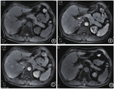 HES可累及全身多个组织器官,以皮肤、肺、心脏、胃肠道、神经系统最为多见,肝、鼻窦、眼受累较为罕见[3,4]。嗜酸性粒细胞肝浸润(eosinophilic liver infiltration, ELI)是一种以嗜酸性粒细胞增殖为特征,浸润局部肝组织所致的肝脏病变,可见于HES、寄生虫感染、过敏反应、恶性肿瘤(包括淋巴瘤、白血病、肺癌、胃癌、胰腺癌、卵巢癌等),组织学表现为慢性活动性肝炎、肝局灶性病变、嗜酸性胆管炎或布加综合征,肝内肿块较为罕见[3]。本病例表现为肝内多发占位。ELI在超声影像中呈低信号,典型的CT表现为多灶性、小的(< 2 cm)、椭圆形或圆形、边缘模糊或清晰、低信号病变,病灶在门脉期最为明显[5]。研究显示,ELI多分布于肝包膜下或门静脉周围[6],特定的影像学位置以及外周血中持续增高的嗜酸性粒细胞在一定程度上有助于诊断。"门静脉穿行征"、"条带征"和"晕环征"可能是ELI的特征性表现[6],但这些表现并非ELI所特有,需与肝细胞癌、转移瘤、胆管细胞癌等相鉴别。MRI相较CT而言具有更好的软组织分辨率,可根据不同时期病灶的强化程度在一定程度上区分病变良恶性。此病例2枚肝结节灶位于肝包膜下,呈现T1WI低信号,T2WI高信号,三期增强扫描"渐进性强化",动脉期"环形强化、片状强化",有别于肝细胞癌和肝转移瘤的"快进快出"[7],和郭保亮等[6]研究一致。与转移瘤不同,ELI形态欠规则、边界欠清,其病变本身在T1WI图像上信号降低程度和在T2WI图像上信号增加程度均较小[8],转移瘤在T2WI上典型的"牛眼征"也有助于鉴别。需要注意的是,胆管细胞癌也可表现"渐进性强化"的特点,但其强化多以延迟期病灶"向心性强化"为主,且可见肝内局限性胆管扩张、局部肝包膜凹陷回缩、肝叶萎缩或肝内胆管结石影等表现,由此可区分。You等[8]研究发现,在含钆对比的肝胆特异性MRI检查中,若未增强T1WI图像上病变的最大直径小于为肝胆期图像上的50%,则对ELI的诊断具有100%的阳性预测意义。这是由于ELI在T1WI图像上,只有坏死部分显示低信号强度,而在肝胆期图像上,坏死和非坏死的嗜酸性浸润部分的信号强度较低,从而导致了病灶在T1WI和肝胆期图像上的大小差异。除此之外,ELI病灶数目、大小与外周嗜酸性细胞计数密切相关,随着嗜酸性粒细胞降至正常,结节呈缩小态势[6],也多提示良性病变,本文病灶治疗前后变化与之一致。尽管ELI有诸多特征性表现,但目前基于影像学区分ELI和恶性肿瘤仍相对困难,尤其是既往有恶性肿瘤病史的患者,对于新发肝内病灶的性质判断上存在较大难度,需要结合病史、实验室检查作出综合判断,如嗜酸性粒细胞增多、IgE升高、接近正常的肝酶和C反应蛋白水平往往提示ELI而非恶性肿瘤[9],若仍存在诊断困难建议及时完善肝穿刺活检。