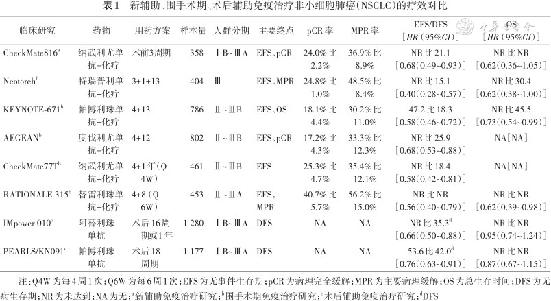 注:Q4W为每4周1次;Q6W为每6周1次;EFS为无事件生存期;pCR为病理完全缓解;MPR为主要病理缓解;OS为总生存时间;DFS为无病生存期;NR为未达到;NA为无;a新辅助免疫治疗研究;b围手术期免疫治疗研究;c术后辅助免疫治疗研究;dDFS