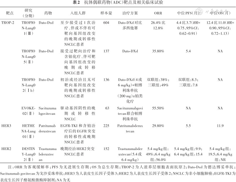 注:ORR为客观缓解率;PFS为无进展生存期;OS为总生存期;TROP-2为人滋养层细胞表面抗原2;Dato-Dxd为德达博妥单抗;Sacituzumab govitecan为戈沙妥珠单抗;HER3为人表皮生长因子受体3;HER2为人表皮生长因子受体2;NSCLC为非小细胞肺癌;EGFR-TKI为表皮生长因子酪氨酸激酶抑制剂;NA为无