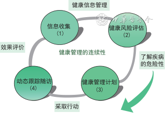 2. 健康管理:健康管理是以现代健康概念(生理、心理和社会适应能力)和新的医学模式(生理-心理-社会)以及中医治未病为指导,通过采用现代医学和现代管理学的理论、技术、方法和手段,对个体或群体的整体健康状况及影响健康的危险因素进行全面检测评估、有效干预与连续跟踪服务的医学行为及过程[4]。完整的健康管理活动应包括以下5个基本步骤:(1)开展健康信息收集与健康检查,了解管理对象的健康状况。(2)开展健康风险评价,评估管理对象的健康风险因素。(3)开展健康干预与健康促进,根据个体健康危险因素制定个性化健康管理方案,严格实施并动态追踪效果。(4)开展健康干预效果评价,根据管理对象健康状况调整干预方案并继续进行管理。(5)上述步骤重复循环,直至达到较好的健康结局。