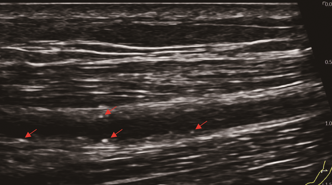 在治疗措施上,除予以增加血液透析次数、加强超滤、纠正贫血、补铁、抗凝、补充白蛋白和纠正钙磷代谢紊乱等常规治疗措施外,经过医院药事委员会和伦理委员会批准,我们还予硫代硫酸钠超说明书用药治疗。治疗方案是我们通过对国内外诊治经验加以系统调研及总结,根据种族差异适当进行了药物减量,由此确定的“中大方案”[16],即从小剂量开始用药,通常以3.2 g/d为起始剂量,逐渐增加剂量(≤6.4 g/d),当出现轻微不良反应时即撤退至前1天最高耐受剂量,用100~250 ml生理氯化钠溶液溶解后静脉滴注,每天1次,2周为1个疗程,推荐每1~2个月进行一疗程治疗。硫代硫酸钠能够与钙离子结合,形成具有高溶解度的硫代硫酸钙,因此可以减轻血管钙化。最新的Meta分析研究亦显示,硫代硫酸钠治疗可延缓维持性血液透析患者血管钙化,包括冠状动脉和髂动脉[17]。我们既往在硫代硫酸钠治疗钙化防御或转移性钙化的临床研究中发现,该药具有显著的抗血管和组织钙化作用,其作用机制与抗氧化应激、抑制炎性反应、舒张血管、保护内皮细胞、抗炎镇痛和上调钙化抑制因子等作用有关[18, 19]。此外,考虑到硫代硫酸钠的药理学作用,尽管缺少直接的证据,我们推测其亦有一定程度改善高凝状态的作用。