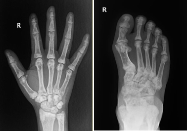 注:患者双手和双足骨质密度不均匀增高,双手部分远节指骨骨质吸收