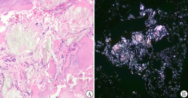 注:A:骨髓部分组织伴纤维组织增生,骨髓小梁结构紊乱伴髓腔变形,部分小梁硬化,髓腔内见多量结晶样物沉积(PAS染色 ×200);B:偏振光镜下可见大量双折光晶体物质沉积(×200)