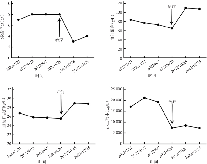治疗上予以增加血液透析次数,由3次/周增至4次/周;加强超滤;纠正贫血、补铁;抗凝;补充白蛋白;纠正钙磷代谢紊乱,以及予3个疗程的硫代硫酸钠治疗(分别为2022/8/15至2022/8/22、2022/9/14至2022/9/26、2022/10/16至2022/10/26,3.2 g/d,静脉滴注)。治疗后患者双手疼痛麻木症状较前好转,乏力、精神萎靡和贫血貌较前明显改善,2022年10月28日复查结果:血红蛋白110 g/L,血清白蛋白29.0 g/L,D-二聚体8 454 μg/L,铁蛋白715.7 μg/L(图5)。