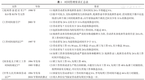 (1)时间管理:轮班作业时间管理旨在合理安排作业人员的工作和休息时间,维护作业人员的休息权利,其重要原则是,允许作业人员在轮班间隔期间有充足的时间休息和恢复,从而维持良好的健康状态。我国及国外相关的法规及文件中提出了时间管理的具体要求,见表1。