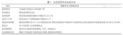(2)作业设计:轮班作业的作业设计原则是尽量减少轮班作业给劳动者带来的负面影响。可以通过调整睡眠时间时长,给予员工更充足的休息来恢复劳动者的作业能力以及家庭和社会生活[55]。轮班制的轮换周期一般不宜过长,较短而规则的轮换制对作业人员及其家庭都有好处,便于安排社会生活。与连续3次以上的夜班比较,连续3次以下的夜班意味着发生事故和可能罹患癌症的风险更低[56]。两班之间的轮班间隔<11 h与伤害的增加有关[57,58],有证据表明两班之间的作业间隔每减少1 h,伤害发生的可能性就会增加5%;减少短时间作业间隔的轮班次数可以降低风险,而增加短时间作业间隔的轮班次数则会导致伤害的风险增加[59]。《夜班和轮班作业的指南》建议[5],应当根据班次的时间和时间安排适当的工作量,以控制轮班作业的危险因素;应在工作人员最警觉和最不易疲劳的阶段安排要求高的工作,应在夜间、清晨或长时间轮班结束时避免进行要求苛刻或危险性高的关键工作,若工作要求特别高,可考虑缩短轮班的时间。在轮班作业系统设计时,应充分考虑相邻班次之间的作业间隔以及夜班数量,充分的休息有助于疲劳的恢复,缓解可能出现的睡眠缺乏,维持良好的健康状态。每个班次的时间长度如何安排对健康影响最小,目前尚无定论。Ahasan等[55]针对关于夜班作业,提出了一些改善建议,见表2。