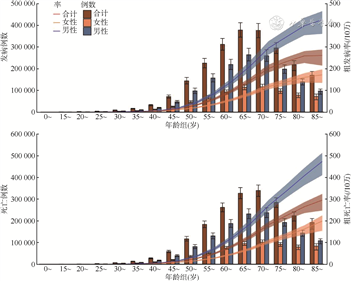 (1)年龄特征:在老年人群中肺癌疾病负担较重。据GLOBOCAN 2020估计,全球劳动力人群(15~64岁)肺癌粗发病率为16.5/10万,而全球老年人群(≥65岁)肺癌粗发病率为188.1/10万,老年人群肺癌粗发病率约为劳动力人群的11倍[7]。全球疾病负担数据(GBD)显示2019年各年龄组中肺癌发病人数呈近似正态分布,65~69岁年龄组人群肺癌新发病例数最多(约38万例),老年人群新发病例约140万例,占全部新发病例的63.7%;全球老年人群肺癌粗死亡率为162.0/10万,约为劳动力人群肺癌粗死亡率(12.1/10万)的13倍。各年龄组肺癌死亡人数也呈近似正态分布,其中70~74岁年龄组人群肺癌死亡人数最多(34万例),老年人群死亡人数为137万例,占全部肺癌死亡病例的67.0%。这些结果均表明,肺癌在老年人群中的发病和死亡负担较重。因此,随着全球人口的增长和人口老龄化持续加重,肺癌发病人数和死亡人数也将会持续增加[8, 9, 10],老年人群肺癌的发病和死亡负担将会进一步加重。不同年龄和不同性别人群肺癌发病和死亡情况见图1。