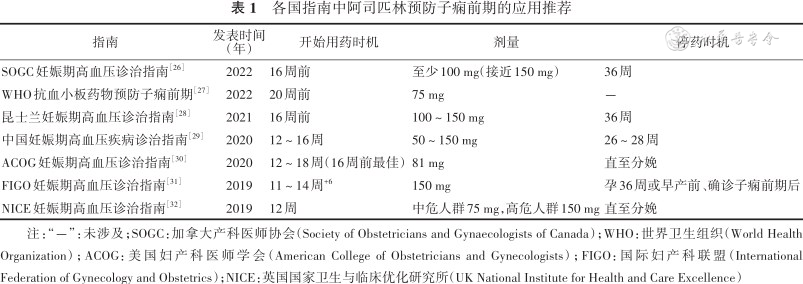 现有研究肯定了阿司匹林对子痫前期,特别是早发型子痫前期的预防效果[25],但在阿司匹林的使用时机和剂量上全球范围内尚未统一,见表1。