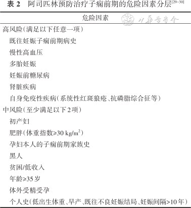 1.阿司匹林的适用人群:结合卫生经济学的考虑,采用危险因素分层方法有助于快速遴选出高危孕妇,并尽早使用阿司匹林,达到减少子痫前期发生、降低围产儿死亡率的目的[33]。目前全球比较公认的危险因素分层方式见表2。