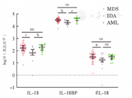 注 MDS:骨髓增生异常综合征;AML:急性髓系白血病;IDA:缺铁性贫血;IL-18Rα:IL-18受体;nsP>0.05,aP<0.05,bP<0.01,cP<0.001