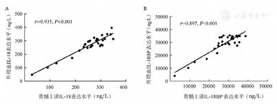 为探究IL-18BP对IL-18的拮抗作用是否仅局限于骨髓原位,我们对31例MDS患者骨髓及外周血同时采样,分别检测IL-18、IL-18BP水平并进行Pearson相关性分析。结果显示MDS患者外周血与骨髓的IL-18(r=0.935,P<0.001)、IL-18BP(r=0.897,P<0.001)均呈正相关,提示二者具有很好的一致性(图2)。