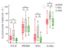 IL-18在MDS患者骨髓微环境中表达增加,但由于IL-18BP的存在导致fIL-18相对减少,与MDS疾病严重程度和CD8+ T细胞功能减低有关。