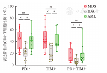 MDS及AML患者PD-1+CD8+/CD8+细胞比例分别为(43.44±16.17)%和(40.73±23.30)%,均显著高于IDA组的(22.63±11.91)%(P值分别为<0.001、0.020)。MDS和AML患者TIM-3+CD8+/CD8+ T细胞比例分别为(42.12±19.51)%和(38.16±19.45)%,均显著高于IDA组的(20.77±12.70)%(P值分别为<0.001、0.031)。MDS和AML患者的PD-1+TIM-3+CD8+/CD8+ T细胞比例分别为(17.55±11.57)%和(16.21±15.75)%,均显著高于IDA组的(6.78±4.90)%(P值分别为<0.001、0.013),提示MDS和AML患者CD8+ T细胞存在免疫耗竭状态(图5)。