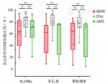 MDS患者骨髓NK细胞分泌的穿孔素水平显著低于IDA组[(57.36±23.81)%对(78.21±12.36)%,P=0.042],颗粒酶B水平明显低于IDA组[(57.44±15.37)%对(69.32±14.98)%,P=0.034],骨髓NK细胞上IL-18Rα的表达水平显著低于IDA组[(63.61±20.40)%对(81.30±11.10)%,P=0.040](图6)。