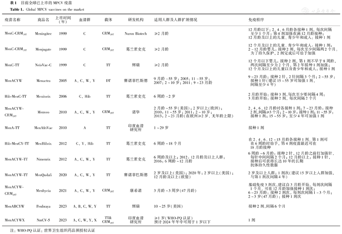 1999年,英国首次引入以CRM197为载体的C群脑膜炎球菌多糖结合疫苗(MenC-CRM197),作为2、3和4月龄婴儿常规疫苗接种,并在1~18岁儿童单剂量加强,在C群脑膜炎球菌病防控方面效果显著[10]。2005年,全球首款MPCV-ACYW在美国成功上市,随后在2010年和2012年另外两款MPCV-ACYW相继上市,我国在2021年底上市国内首款可用于6月龄以内的MPCV-ACYW,为婴幼儿提供更全面有效的保护。