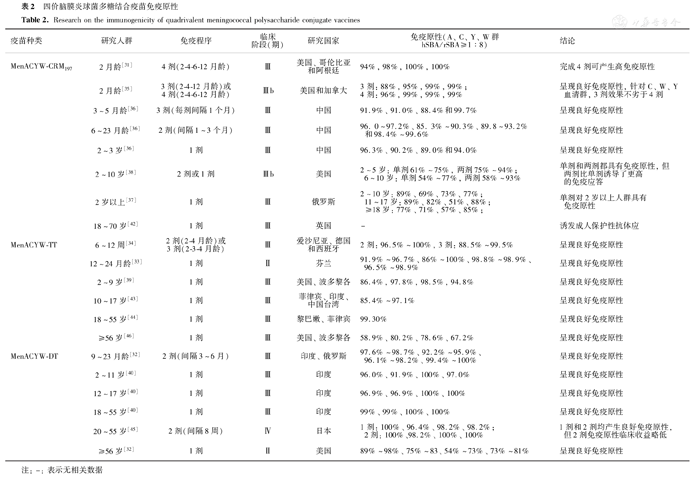 | 疫苗种类 | 研究人群 | 免疫程序 | 临床阶段(期) | 研究国家 | 免疫原性(A、C、Y、W群hSBA/rSBA≥1∶8) | 结论 |