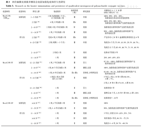 | 持久性 | 2月龄[49] | 完成4剂,5岁加强1剂 | Ⅲb | 美国 | 产生针对C、W和Y血清群抗体持续长达4年 | |
