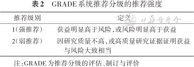 | 2(弱推荐) | 因研究质量不高,或高质量研究证据证明获益与风险大致相当 |