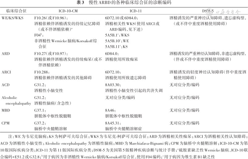 关于慢性ARBD的临床诊断分类和编码,分别经历了第10版、第11版国际疾病分类(ICD-10-CM和ICD-11)和美国第4版、第5版精神疾病诊断与统计手册(DSM-4和DSM-5)的分类修订与更新,目前根据最新ICD-11的疾病分类,各种常见ARBD临床综合征的诊断编码如表3。