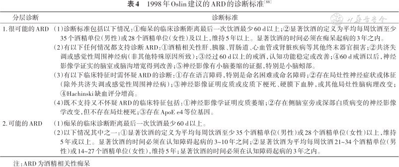 2.根据临床综合征的不同,各类型ARBD诊断标准如下:(1)ARD:Oslin等[88]在1998年提出了ARD的诊断标准可作临床诊断参考。ARD首先需要符合诊断痴呆的标准:记忆严重受损并至少1个其他认知域功能损害,并且需首先排除谵妄状态或其他成瘾物质导致的中毒或戒断综合征。然后再根据以下标准诊断为:很可能的ARD和可能的ARD(表4)。(2)WE:参考EFNS指南[89],WE的诊断标准为饮酒者出现以下要点的2个或以上:①膳食性缺乏(维生素B1缺乏);②眼征(眼肌麻痹);③共济失调;④意识状态改变或轻度记忆损害。KS尚缺乏公认的诊断标准,部分KS病例符合上述WE的诊断标准,并且具有明显的记忆障碍。(3)其他ARBD类型:也尚缺乏公认诊断标准,结合长期饮酒史、临床症状/体征和影像学特征,排除其他类似临床表现的疾病后可诊断。