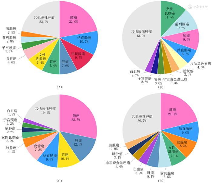 2022年美国恶性肿瘤新发病例预计为238.0万(男性128.4万,女性109.6万),世标发病率367.0/10万,发病例数前5位的恶性肿瘤为女性乳腺癌(11.5%)、前列腺癌(9.7%)、肺癌(9.5%)、结直肠癌(6.7%)和皮肤黑色素瘤(4.3%)。2022年美国恶性肿瘤死亡例数预计为60.6万(男性32.1万,女性28.5万),世标死亡率82.3/10万,死亡前5位的恶性肿瘤分别为肺癌(21.1%)、结直肠癌(9.0%)、胰腺癌(8.2%)、女性乳腺癌(7.1%)和前列腺癌(5.6%)。中美两国恶性肿瘤患者最常见的死因均为肺癌。与中国癌谱不同的是,美国乳腺癌和前列腺癌分别位居女性和男性恶性肿瘤发病首位,二者发病例数均超过肺癌,且均位居恶性肿瘤死亡原因前5位,而中国恶性肿瘤死因第2~5位则均为消化系统肿瘤(图1)。