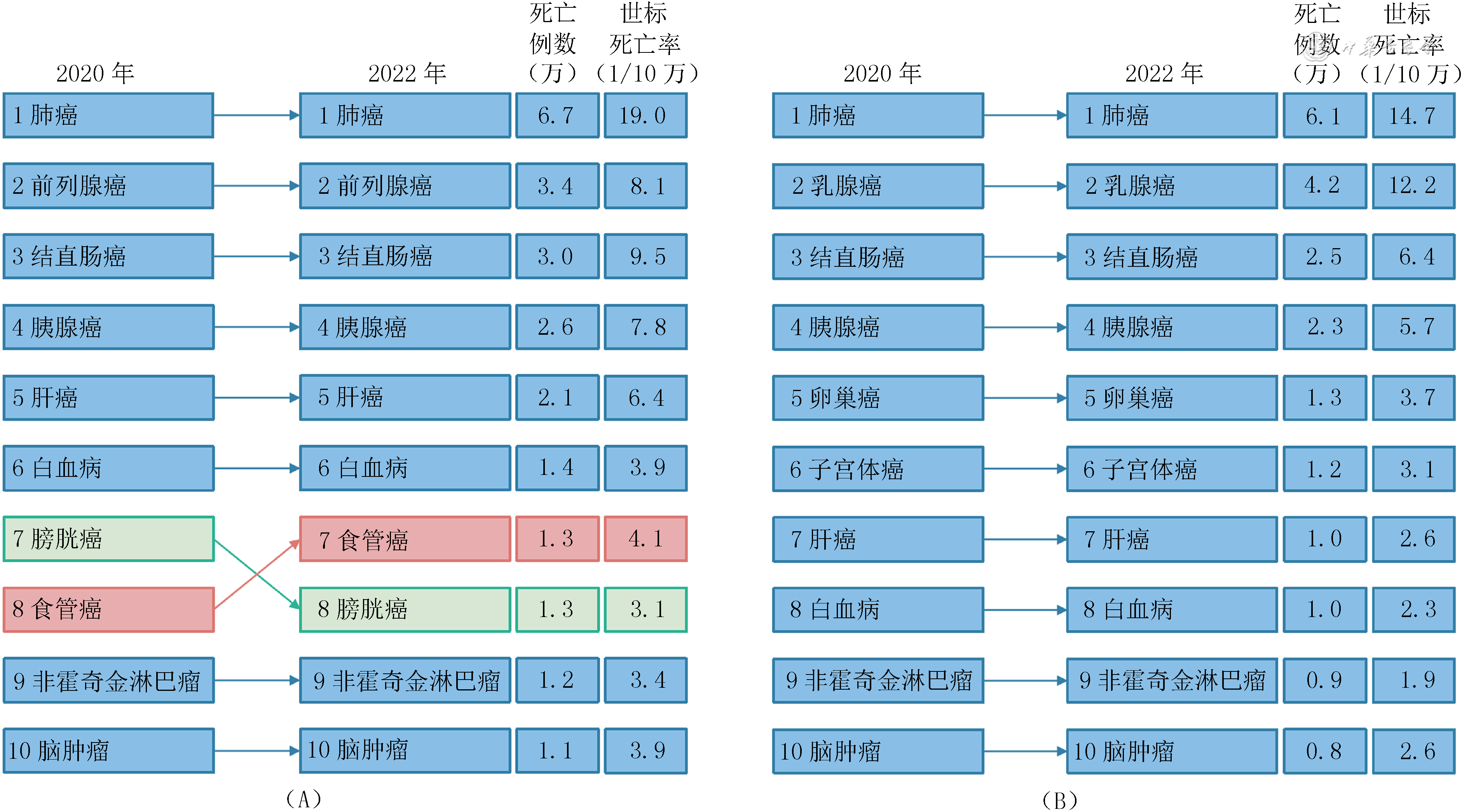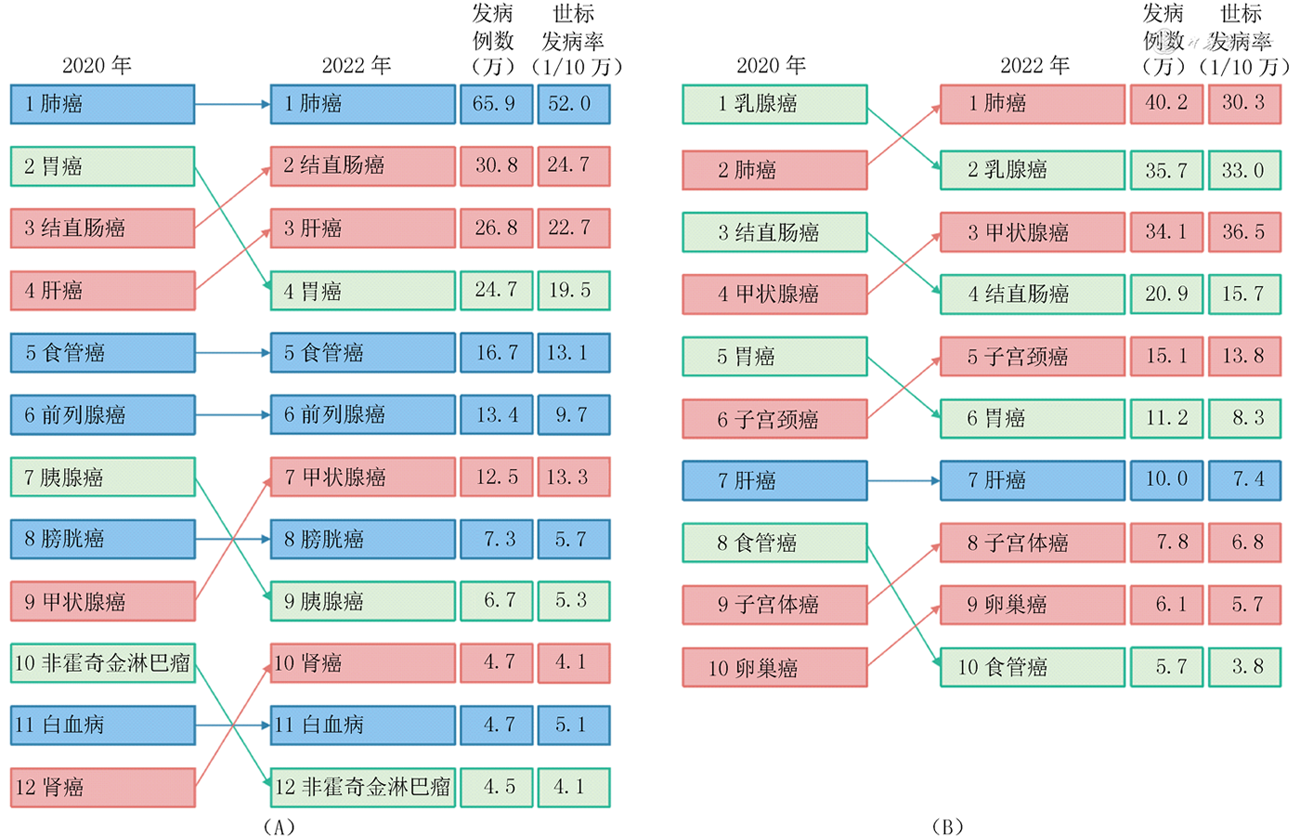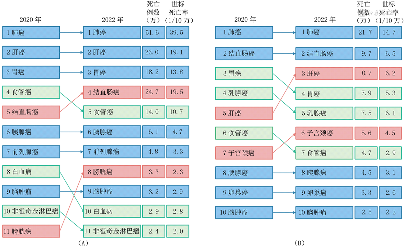 肺癌、肝癌、结直肠癌、胃癌、食管癌在中国男性和女性中均为恶性肿瘤的主要死因。与2020年相比,2022年中国男性结直肠癌和膀胱癌死亡顺位上升,女性肝癌和子宫颈癌死亡顺位上升,男女食管癌死亡顺位则均有所下降(图3)。