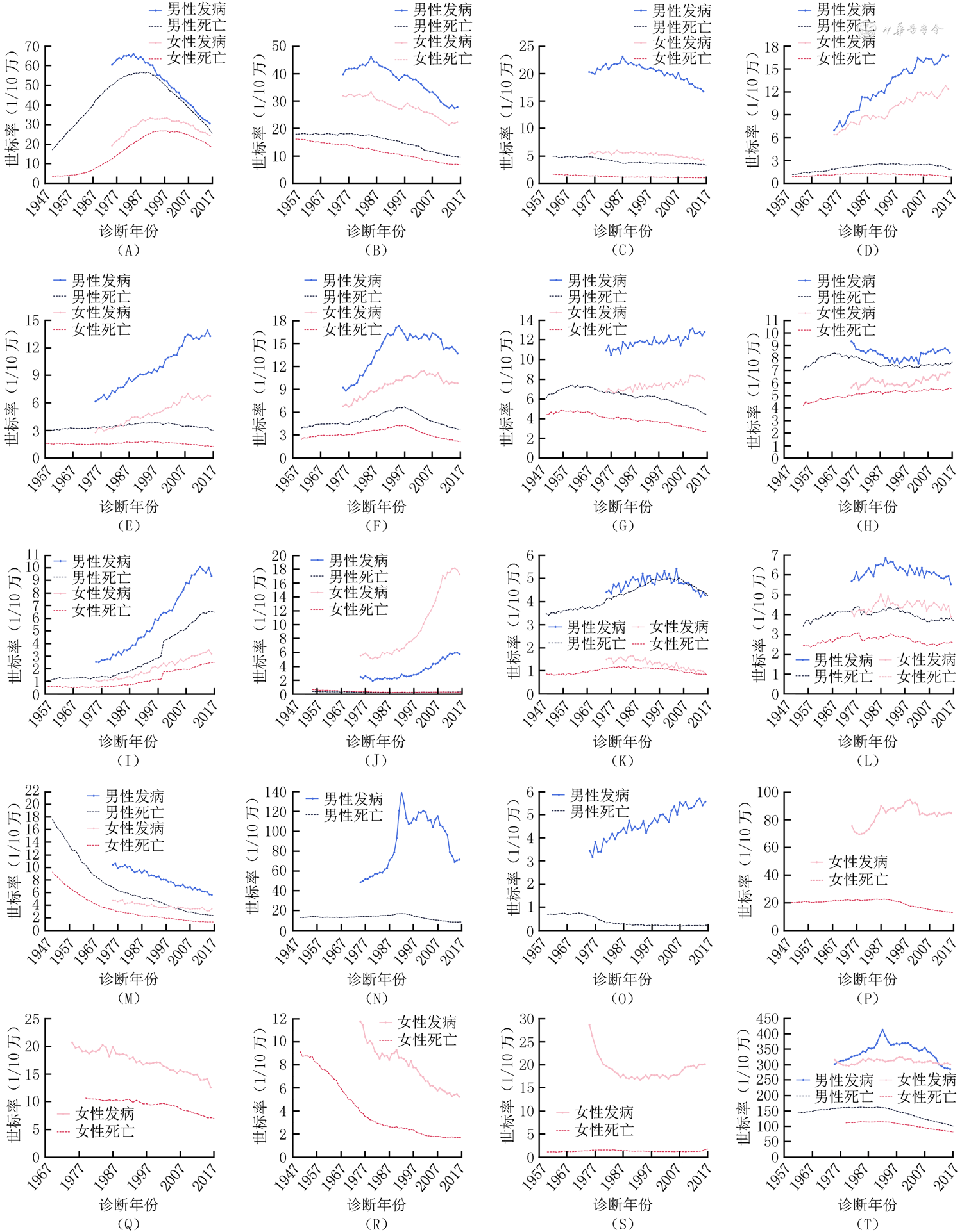 采用描述性研究方法,统计指标包括不同部位恶性肿瘤的发病和死亡例数、世界人口年龄标准化发病率(世标发病率)和死亡率(世标死亡率)、5年相对生存率、人群归因分数(population attributable fraction,PAF)。世标率采用Segi's世界标准人口年龄构成,5年相对生存率标化采用国际癌症生存标准。根据国际疾病分类第10版编码,本文纳入分析的主要恶性肿瘤包括食管癌(C15)、胃癌(C16)、结直肠癌(C18~21)、肝癌(C22)、胰腺癌(C25)、肺癌(C33~34)、皮肤黑色素瘤(C43)、乳腺癌(C50)、子宫颈癌(C53)、子宫体癌(C54)、卵巢癌(C56)、前列腺癌(C61)、肾癌(C64)、膀胱癌(C67)、脑肿瘤(C70~72)、甲状腺癌(C73)、非霍奇金淋巴瘤(C82~86,C88)和白血病(C91~95)。