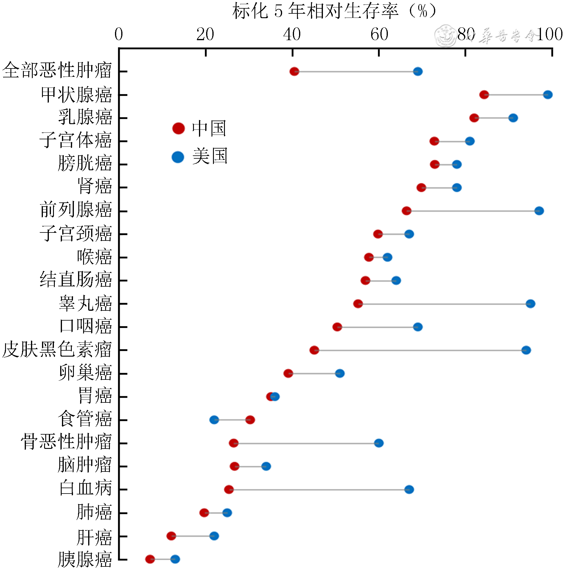 2003—2015年,我国恶性肿瘤总体标化5年相对生存率从30.9%上升至40.5%。除胆囊癌和胰腺癌的5年相对生存率出现下降外(分别从20.1%和11.7%下降至16.4%和7.2%),我国其他主要恶性肿瘤5年相对生存率均呈上升趋势,如甲状腺癌5年相对生存率由2003—2005年的67.5%上升至2012—2015年的84.3%,乳腺癌由73.1%上升至82.0%,子宫体癌由55.1%上升至72.8%等[6]。相较于美国,中国主要恶性肿瘤5年相对生存率除食管癌外均低于美国,总体标化5年相对生存率相差约20个百分点(图7)。