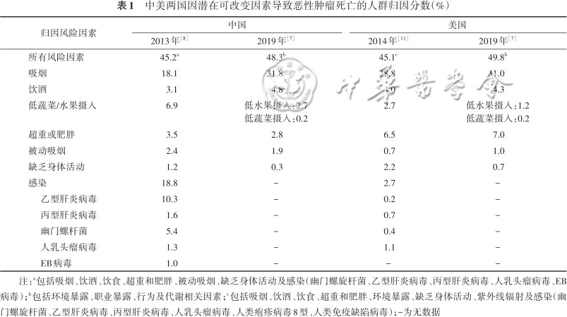 中美两国因潜在可改变因素导致恶性肿瘤死亡的人群归因分数(%)