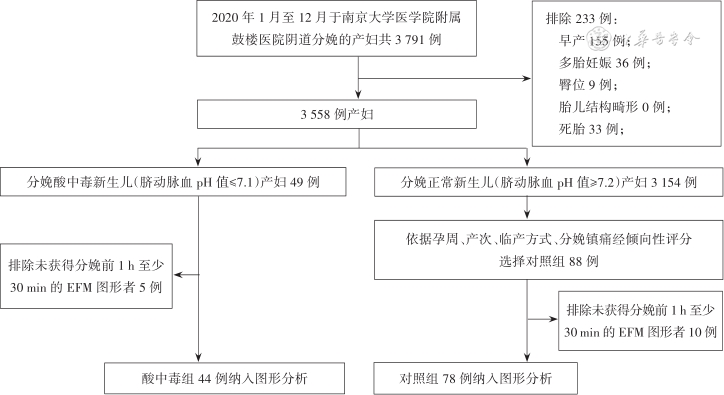 2020年1月至2020年12月本院共3 791例产妇阴道分娩。按前述标准排除233例后,最终3 558例进入本研究。其中酸中毒新生儿49例,正常新生儿3 154例。经倾向性评分匹配后,酸中毒组44例,对照组88例。剔除对照组中未获得分娩前1 h至少30 min的EFM图形者10例后,2组分别有44和78例进行EFM图形分析。本研究的纳入排除流程见图1。