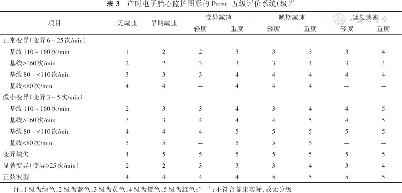 在产时EFM应用几乎达100%的日本[14],则推荐采用2007年由Parer和Ikeda[13]提出的五级评价系统进行产时EFM分级评价(表3)。该系统根据胎心率基线水平和基线变异程度、减速的深度和频率,总结了134种可能的胎心减速组合,从而将产时EFM划分为5级。每种类别都与不同程度的胎儿酸中毒风险水平相关。该系统对1~5级分别使用绿色、蓝色、黄色、橙色和红色标记风险度,并据此提出分层管理措施[15]。