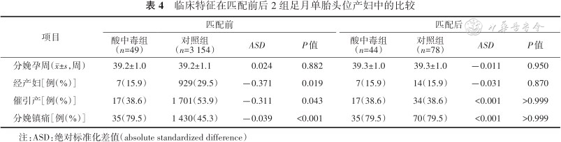 酸中毒组 (n=49) | 对照组 (n=3 154) | ASD | P值 | 酸中毒组 (n=44) | 对照组 (n=78) | ASD | P值 | |