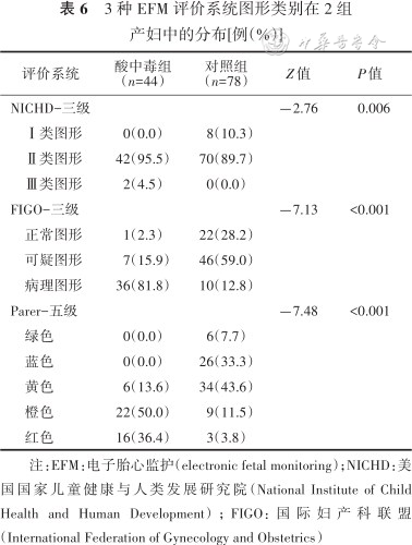 在NICHD-三级评价系统中,酸中毒组和对照组图形分别有95.5%(42/44)和89.7%(70/78)归入提示可疑胎儿酸碱失衡的Ⅱ类图形,仅4.5%(2/44)的酸中毒组EFM图形被正确解读为Ⅲ类图形。FIGO-三级评价系统中酸中毒组81.8%(36/44)的图形为“病理图形”;Parer-五级评价系统中提示胎儿酸碱失衡的“橙色或红色”风险也可识别86.4%(38/44)的酸中毒组EFM图形。