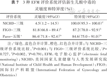NICHD-三级评价系统用于评估新生儿酸中毒的灵敏度(95%CI)为4.5%(1.2%~14.5%)。FIGO-三级和Parer-五级评价系统的灵敏度均明显高于NICHD-三级评价系统,特异度明显下降。FIGO-三级和Parer-五级评价系统评估新生儿酸中毒的灵敏度及特异度差异无统计学意义。见表7。