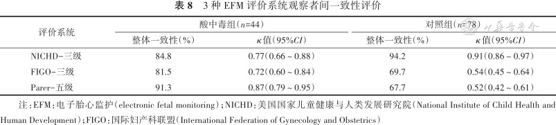 分析产时电子胎心监护(electronic fetal monitoring,EFM)Parer-五级、美国国家儿童健康与人类发展研究院(National Institute of Child Health and Human Development,NICHD)-三级和国际妇产科联盟(International Federation of Gynecology and Obstetrics,FIGO)-三级评价系统评估新生儿酸中毒的有效性和观察者间一致性。