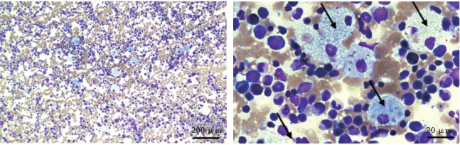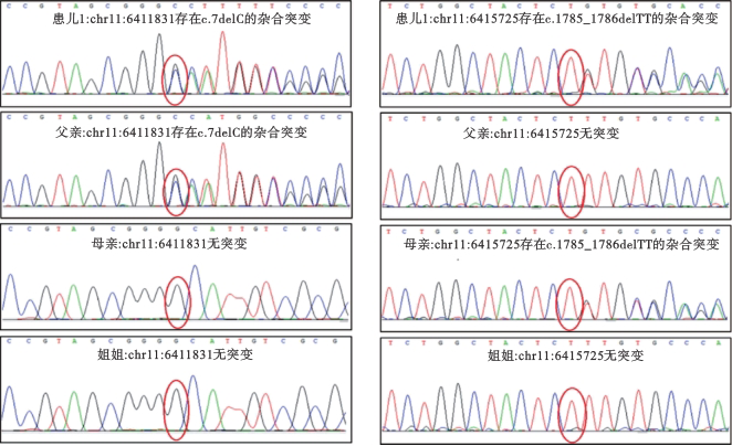 患儿,女,10月龄,20余天前因发热就诊于当地医院,给予抗细菌、抗病毒治疗,血常规提示小细胞低色素性贫血,予补充铁剂“右旋糖酐铁”治疗。口服铁剂16 d后患儿血红蛋白进一步下降,为进一步治疗就诊于我院,门诊以“贫血待查”收住院。体格检查:发育正常,神志清楚,精神一般,有轻度贫血貌,唇欠红润,咽稍充血。右侧腹股沟区触及到直径4 mm左右的淋巴结,质软,活动度尚可。腹软,肝肋下6 cm,质稍韧,脾肋下5 cm,质软。四肢无畸形,关节无红肿,运动无障碍,肌张力、肌力正常。血常规:白细胞总数5.30×109/L,中性粒细胞计数4.40×109/L,血小板计数114×109/L,血红蛋白68 g/L,MCV:69.0 fl,C反应蛋白<5.00 mg/L;肝功能:谷丙转氨酶99.50 U/L,谷草转氨酶203.21 U/L,总胆红素34.17 μmol/L,直接胆红素26.49 μmol/L;血脂:甘油三酯1.96 mmol/L,高密度脂蛋白0.45 mmol/L。胸部CT:肺部纹理增多,局部稍模糊,左肺可见少许斑点状致密影,考虑为支气管炎。B超:肝右叶肋下33 mm,肝脏边缘规则,肝内回声均匀,未见实性光团;脾脏大小130 mm×35 mm,肋下55 mm,边缘规则,其内回声均匀,提示肝、脾增大。骨髓细胞形态学检查:红系增生,尼曼-匹克样细胞多见(图1)。进一步完善基因检测结果显示患儿在NPD相关基因SMPD1存在两处杂合突变c.7delC(缺失突变)和c.1785_1786delTT(缺失突变),经家系验证显示分别来自父亲和母亲,患儿姐姐两个位点均无突变(图2)。这两处突变在HGMD 数据库中均有致病报道,报道疾病为NPD。综上结果该患儿诊断为NPD A型。给予保肝及其他对症治疗。一年后患者因重症肺炎再次入院,此时患者出现脾功能亢进、肝功能损害、贫血、低白蛋白血症,对症治疗后好转出院。电话随访患者于2岁3月龄时因肺部感染死亡。
