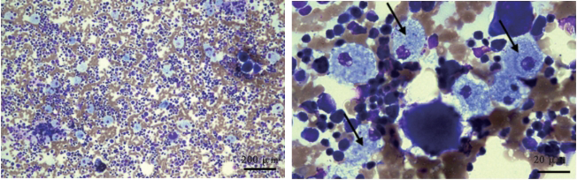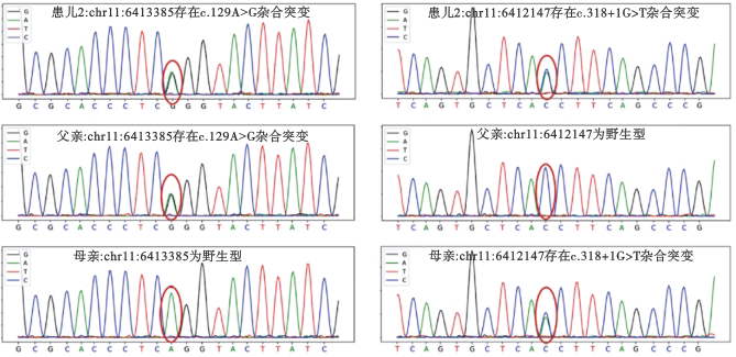 患儿,女,3岁,因入园前体检诊断为“发育迟缓”就诊于我院。患儿足月出生,6月龄能抬头,8月龄能独坐,1岁会叫爸爸妈妈,2岁会独走,现不会自己进食,不会跑、下蹲、双脚跳及单脚跳,社交能力差。父母身体健康,7岁哥哥生长发育正常。既往史:出生至今间断腹泻,为稀水样便,蒙脱石散、益生菌治疗后可好转,但停药后腹泻易反复;1.5岁时曾诊断贫血。体格检查:发育落后,神情略呆滞,精神尚可,颜面部粗糙、多毛,颜面及双手指端稍肿胀,双手掌侧皮肤可见类肝掌样改变,咽充血,双侧扁桃体Ⅱ°肿大,双肺听诊呼吸音粗。腹软,肝肋下6 cm,质韧,脾肋下11 cm,质硬。肌力、肌张力正常。眼底照相双眼底黄斑区可见樱桃红斑。血常规:白细胞总数4.28×109/L,中性粒细胞计数0.78×109/L,血小板计数94×109/L,血红蛋白115 g/L,MCV:80.8 fl。肝功能:谷丙转氨酶75.70 U/L;血脂:总胆固醇4.40 mmol/L,甘油三酯2.84 mmol/L,高密度脂蛋白0.41 mmol/L。B超:肝肋下30 mm,边缘规则,肝内回声增粗;脾大小120 mm×50 mm,脾肋下161 mm,边缘规则,提示肝、脾增大。胸部CT:双肺弥漫间质增厚网结影,双下肺为著。骨髓细胞形态学检查:骨髓增生活跃,粒系增生降低,红系增生活跃,血小板少见,尼曼-匹克细胞多见,细胞体积较大且胞质中含大量空泡,少量细胞吞噬成熟红细胞及血小板(图3)。进一步完善基因检测结果显示患儿在SMPD1基因,染色体位置chr11:6413385存在一处杂合突变c.129A>G,该突变来自于父亲,母亲为野生型。在SMPD1,染色体位置chr11:6412147存在一处杂合突变c.318+1G>T,该突变来自于母亲,父亲为野生型,家系验证为复合杂合突变(图4)。验证位点1 HGMD 数据库未收录,验证位点2 HGMD 数据库有致病报道,报道疾病为NPD。患儿骨髓细胞中可见典型的尼曼-匹克细胞,且肝脾肿大,伴有血小板低下,神经系统受累,眼底可见樱桃红斑,肺部有纤维化,结合患儿智力发育低下,提示为NPD A型。考虑患儿一般情况尚可,准予出院观察,嘱家长出院后加强护理,定期监测血常规、血脂、胸部CT及肺功能等。一年半后患者因全身浮肿再次入院,此时患者出现大量腹水、弥散性血管内凝血、呼吸道感染、肝功能衰竭、脾功能亢进、低蛋白血症、低钾血症、血小板减少、贫血症状,家长放弃治疗出院。