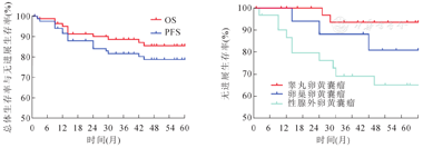 中位随访时间为62.1(1.5~133.1)个月。16例复发患儿中,6例SYST发生原位复发,4例胸腔肺转移,3例发生盆腔多发转移,1例肝转移,1例大网膜、主动脉旁淋巴结转移,1例OYST转移至对侧卵巢。14例复发患儿接受了挽救性治疗,其余2例患儿家长放弃继续救治。存活75例,死亡10例(表2)。不同原发部位的5年无进展生存率(progression-free survival, PFS)差异具有统计学意义(P=0.004),分别为94.6%、82.4%、64.5%。全体患儿的5年OS为87.1%(95%CI:79.7%~94.5%),5年PFS为79.8%(95%CI:70.6%~89.0%)(图1)。