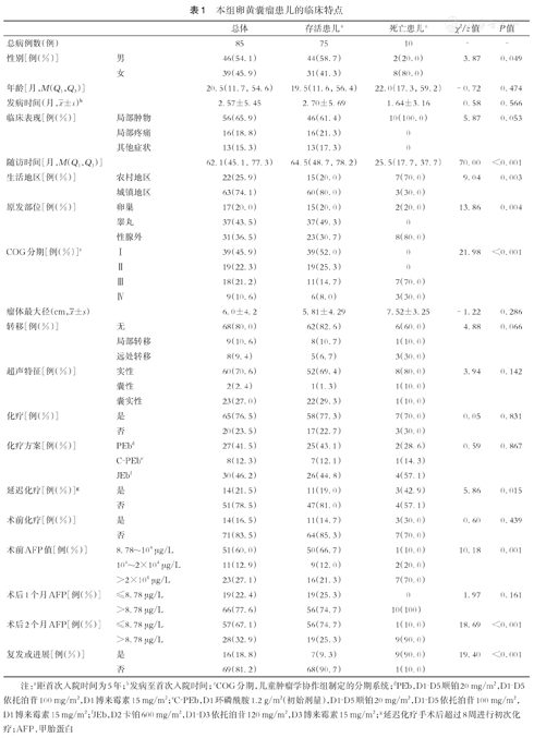 收集安徽省儿童医院2010年1月至2018年8月期间诊断为YST患儿的临床病例资料。纳入标准:①病理诊断确诊为YST;②年龄0~18岁;③具备完整的临床数据;④随访成功。排除标准:①其他病理类型的生殖细胞肿瘤;②颅内YST;③未在本院行手术治疗。根据纳入及排除标准,最终纳入85例YST患儿。
