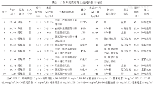 | 序号 | 年龄(月) | 原发部位 | COG分期 | 瘤体最大径(cm) | 术前AFP值(μg/L) | 手术切除情况 | 化疗方案 | 术后2个月AFP值(μg/L) | 初诊时转移部位 | 复发部位 | 随访时间(月) | 死亡原因 |
