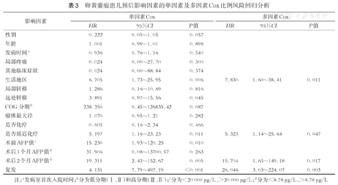 卵黄囊瘤患儿预后影响因素的单因素及多因素Cox比例风险回归分析