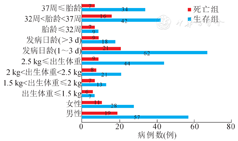 回顾性分析患儿的临床资料,包括性别、胎龄、入院日龄、入院时体重、主要临床表现、术前相关检查结果、手术情况、术后病理及预后,根据患儿是否存活,将其分为生存组与死亡组,分析导致患儿死亡的主要相关因素。生存组及死亡组患儿的性别、胎龄、日龄、体重的分布情况见图1、表1。