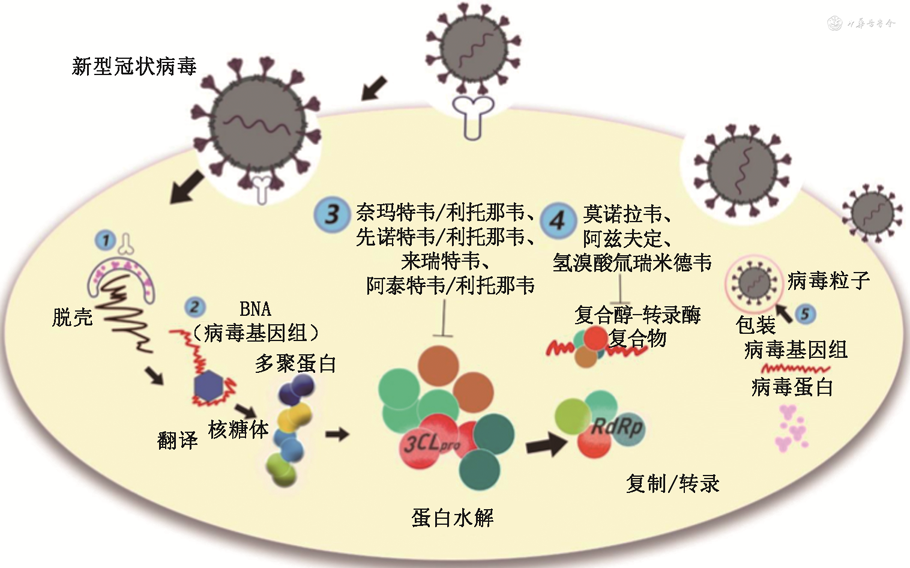 注:3CLpro为3-胰凝乳蛋白酶样蛋白酶;①新冠病毒脱壳;②新冠病毒翻译;③新冠病毒复制过程中蛋白水解酶水解;④由RNA依赖性RNA聚合酶(RdRp)介导的新冠病毒复制过程;⑤新合成的病毒核酸和蛋白质被组装成熟成新的病毒颗粒