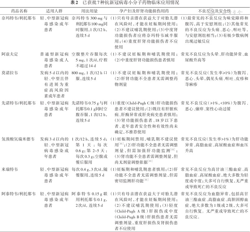 | 奈玛特韦/利托那韦 | 轻、中型新冠病毒感染成年患者 | 奈玛特韦300 mg与利托那韦100 mg同时服用,1 次/12 h,连续5 d | (1)只有母亲潜在获益大于对胎儿潜在风险时,才能在妊娠期间使用;(2)不建议哺乳期使用;(3)中度肾功能损伤者应将奈玛特韦减半服用;(4)重度肝肾功能损伤者不应使用 | (1)最常见的不良反应为味觉障碍和腹泻,高于安慰剂组;(2)其他常见的不良反应为头痛、恶心、呕吐等,与安慰剂组相当;(3)有极少数病例出现过敏反应 |