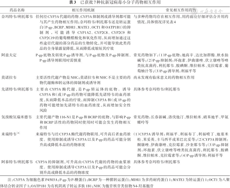 | 奈玛特韦/利托那韦 | 任何经CYP3A代谢的药物、CYP3A抑制剂或诱导剂都可能与其产生药物相互作用;奈玛特韦/利托那韦还是转运蛋白(P-gp、BCRP、MDR1、MATE1、OCT1和OATP1B1)的抑制剂,可能诱导CYP1A2、CYP2C8、CYP2C9和CYP2C19的葡萄糖醛酸化和氧化作用,从而增加通过这些途径代谢的部分药品的生物转化,并可能导致此类药品的全身暴露量降低,从而降低或缩短其疗效 | 与多种药物均存在相互作用,用药前应仔细评估合并用药情况,具体情况详见表4 |
